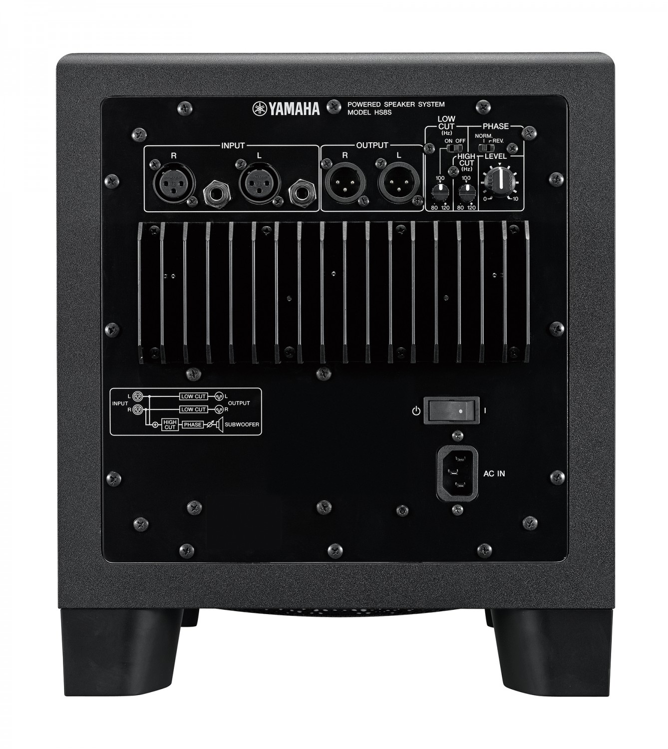 El control HIGH CUT ajusta la frecuencia de corte de la atenuación de altas frecuencias de la salida del subwoofer entre 80 Hz y 120 Hz, mientras que el interruptor PHASE ajusta la fase de la salida del subwoofer. El selector LOW CUT y los controles LOW CUT permiten atenuar las bajas frecuencias en la salida entre 80 Hz y 120 Hz. El subwoofer HS8S está equipado con entradas XLR y conectores TRS, así como con salidas XLR para L y R y salida EXT SUB
