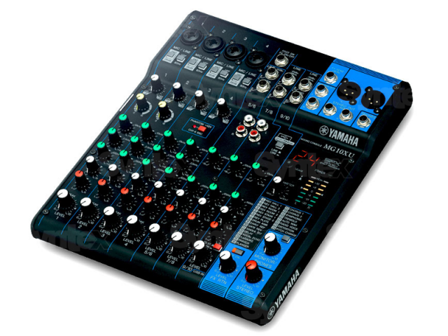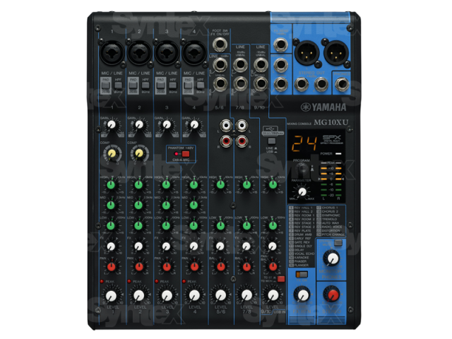 La MG10XU de Yamaha es una mesa de mezclas compacta de diez canales con efectos integrados, ideal para actuaciones, conferencias, grabaciones y aplicaciones similares. La mesa de mezclas cuenta con cuatro entradas combinadas de micrófono/línea con preamplificadores de micrófono D-PRE, así como seis entradas de línea de 1/4" con control de nivel estéreo. También cuenta con una conexión USB y es capaz de proporcionar dos canales de entrada y dos de salida a un ordenador con una frecuencia de hasta 24 bits/192 kHz, lo que resulta ideal para grabar actuaciones en directo, maquetas y similares.