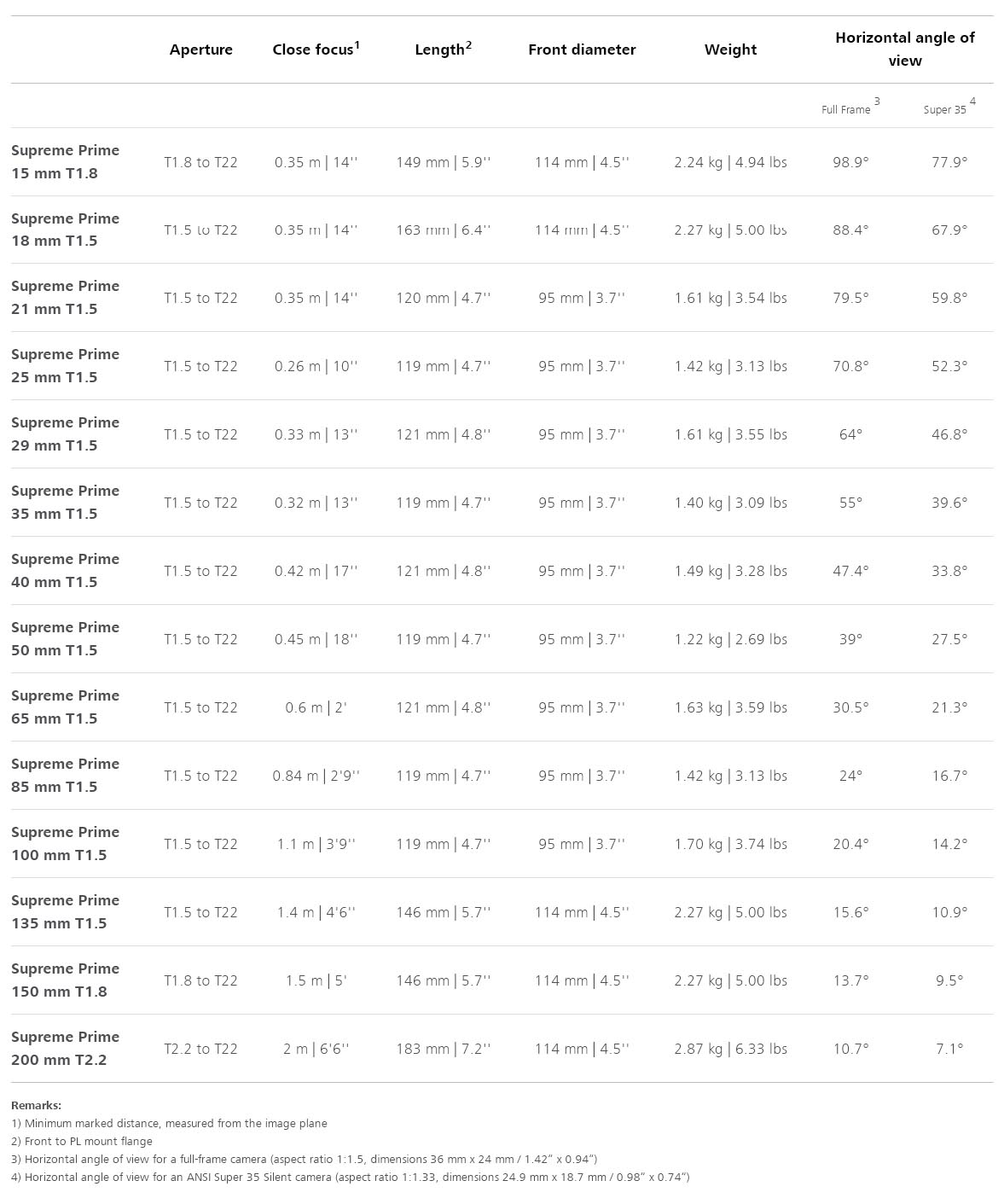 La gama de objetivos cinematográficos de alta gama ZEISS Supreme Prime ofrece la máxima uniformidad en todos los modelos: cobertura uniforme del sensor, reproducción cromática, luminosidad (T1,5 en la mayoría de los modelos), tamaño, peso y disposición de los controles. Todos los objetivos de la gama cubren de forma fiable los sensores FF (diámetro de imagen de 46,2 mm), son compatibles con la tecnología eXtended Data y, gracias a la tecnología de montura intercambiable «Interchangeable Mount System», son compatibles con las monturas PL, LPL y EF (los objetivos se suministran de serie con montura PL y marcas métricas).