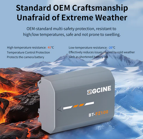 La BT-FZ100 es una batería de repuesto de alta capacidad de 2600 mAh (7,2 V) totalmente compatible con las cámaras Sony, que funciona exactamente igual que la NP-FZ100 original —sin ventanas emergentes, comunicación completa con la cámara y exactamente el mismo tamaño físico— y, además, ofrece compatibilidad con la carga rápida (carga completa en ~2,5 horas con los cargadores ZGCINE PS/PC) y una protección de seguridad premium de 8 capas.
