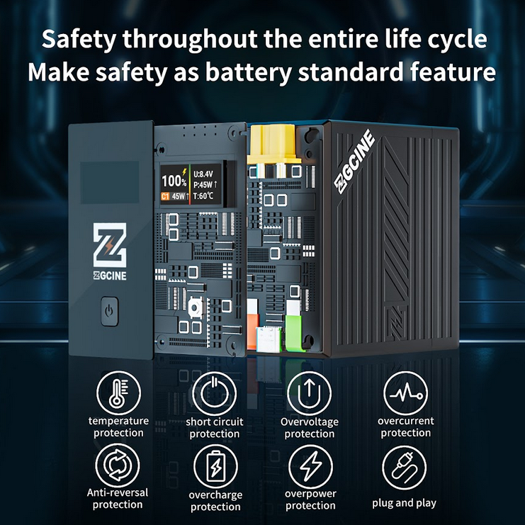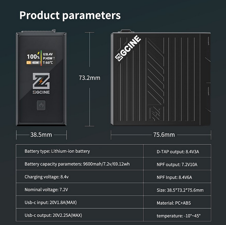 La ZGCINE BT-NPF970 es una batería compacta de iones de litio de la serie L con una capacidad de 9600 mAh (69,12 Wh), que cuenta con carga rápida PD de hasta 36 W, salidas D-TAP (8,4 V/3 A) y NPF, monitorización de tensión, potencia y temperatura en tiempo real en una pantalla OLED y protecciones de seguridad integrales: ideal para alimentar equipos de vídeo profesionales, monitores y luces.