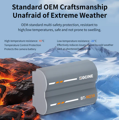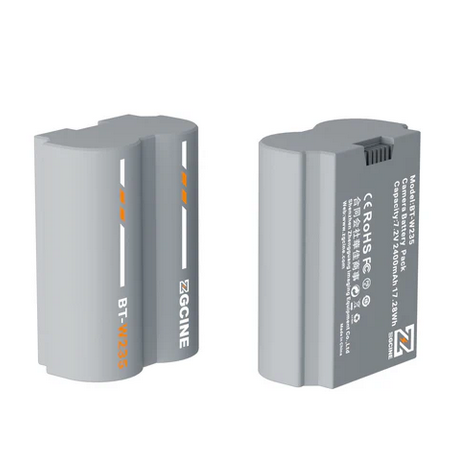 La ZGCINE BT-W235 es una batería de repuesto de otro fabricante totalmente compatible, con una capacidad de 2400 mAh (7,4 V) para cámaras Fujifilm, que coincide con la batería original NP-W235 en cuanto a tamaño y rendimiento —sin avisos, comunicación total con la cámara— y, al mismo tiempo, ofrece una carga rápida (carga completa en ~2 horas con los cargadores ZGCINE PS/PC) y una robusta protección de seguridad de 8 capas para una fotografía fiable y prolongada.