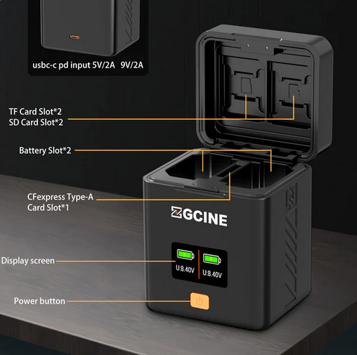 La funda de carga ZGCINE para la batería Fujifilm NP-W235 es una solución compacta y eficaz para cargar la batería NP-W235 con carga rápida a través de USB-C PD, varias ranuras para tarjetas y una pantalla OLED clara que facilita el seguimiento.
