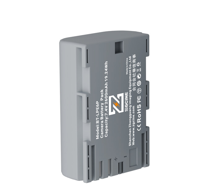La batería ZGCINE LP-E6P para cámaras es una batería de alta capacidad de 7,2 V y 2600 mAh diseñada para determinadas cámaras Canon, cámaras Blackmagic Pocket Cinema y modelos Z CAM, y es compatible con diversos cargadores, empuñaduras y sistemas inalámbricos de control de objetivos.