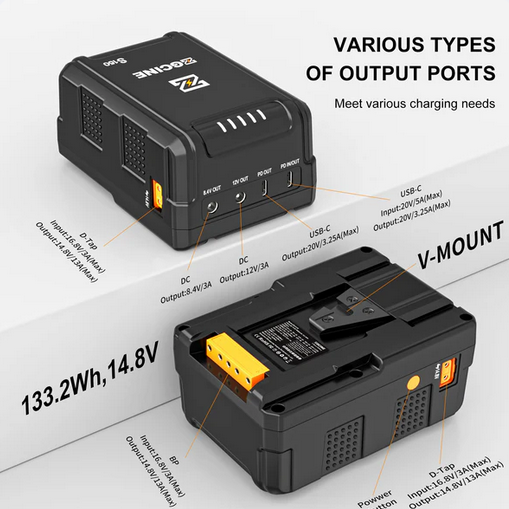 La batería ZGCINE V-Mount de 16,8 V y 150 Wh es una solución de alimentación de alta capacidad con múltiples salidas, equipada con dos puertos USB-C PD, dos D-Tap y dos salidas de CC, lo que la hace ideal para equipos profesionales de vídeo y fotografía.