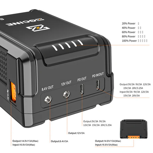 La batería ZGCINE V-Mount de 16,8 V y 150 Wh está diseñada para proporcionar una alimentación de alto rendimiento, por lo que es ideal para cámaras de cine, luces LED y accesorios cinematográficos. Gracias a sus dos puertos USB-C PD independientes, dos salidas D-Tap y dos salidas de CC, esta batería ofrece una alimentación versátil y estable para varios dispositivos a la vez.
