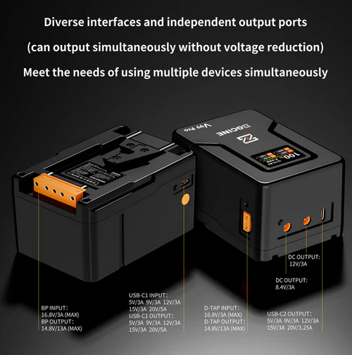 La batería ZGCINE ZG-V99Pro V-Mount está diseñada para profesionales que necesitan una fuente de alimentación eficaz y fiable para sus dispositivos. Esta versión mejorada de la batería V99 cuenta con carga rápida PD de 100 W, lo que permite cargarla por completo en tan solo 1,5 horas con un cargador de 100 W. La pantalla de 1,1 pulgadas muestra información importante, como el voltaje, la potencia total y la temperatura, lo que permite supervisar la batería y los dispositivos en tiempo real.