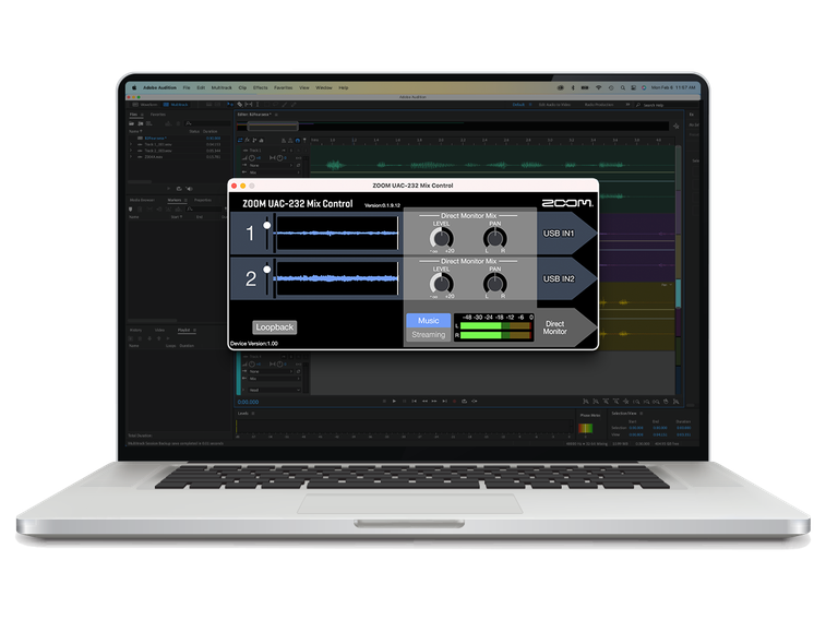 El software UAC-232 Mix Control permite ajustar el enrutamiento de E/S, activar el bucle de retroalimentación y controlar los niveles de entrada y monitorización. También puedes activar el modo Music para el enrutamiento a un DAW o el modo Streaming, que combina todas las entradas en una sola señal para el software de streaming.