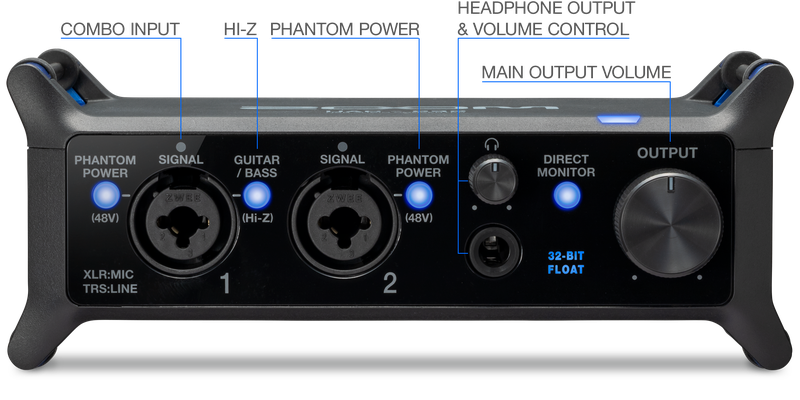 El convertidor de audio USB UAC-232 cuenta con dos entradas combinadas XLR/TRS para nivel de micrófono o de línea con alimentación fantasma de +48 V para micrófonos de condensador. Con el botón Guitar/Bass se activa el modo Hi-Z para la grabación directa de guitarra.