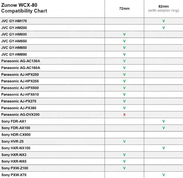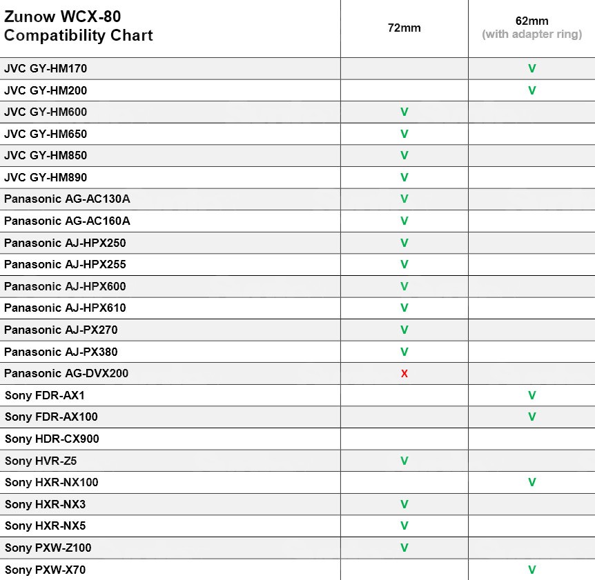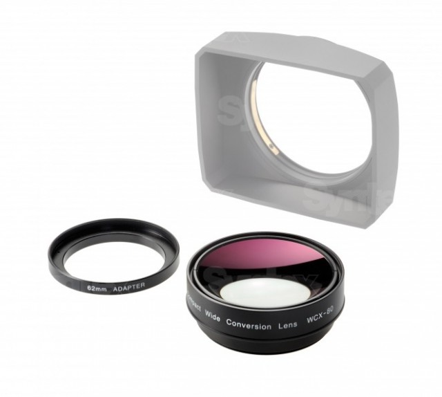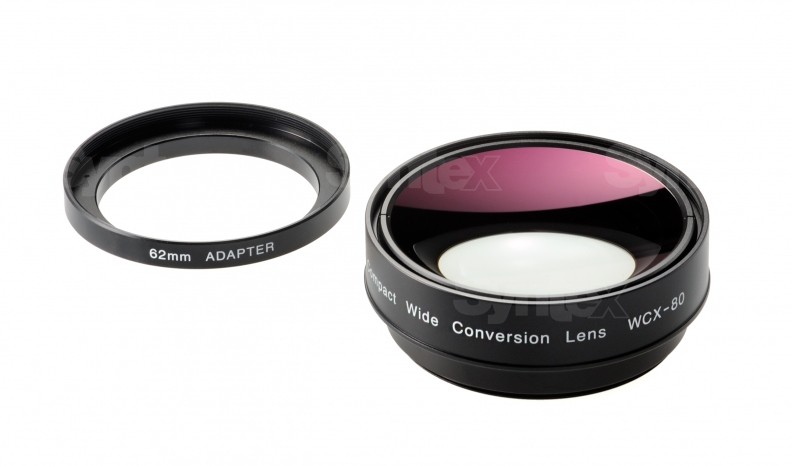 Accesorio gran angular de la marca japonesa Zunow. Aumento de 0,8x, compatible con cámaras Panasonic, JVC y Sony. Para roscas de 72 y 62 mm (el adaptador de 72 mm a 62 mm se incluye en el paquete).